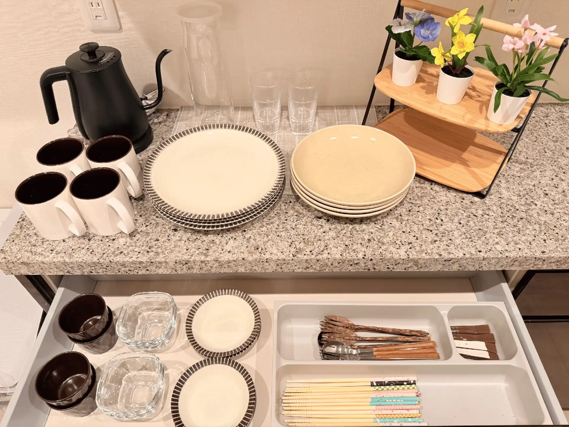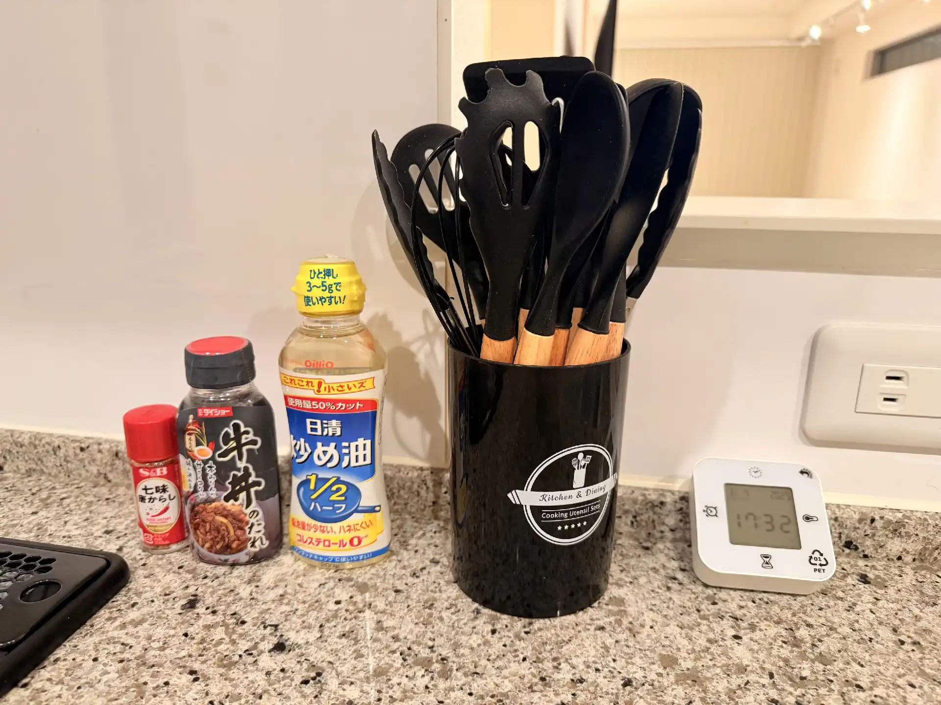 冰箱、微波爐、烹飪用具(鍋碗瓢盆)、餐具(碗、筷、盤、杯等)、小冰箱、冷凍庫、熱水壺、烤箱、洗碗機。